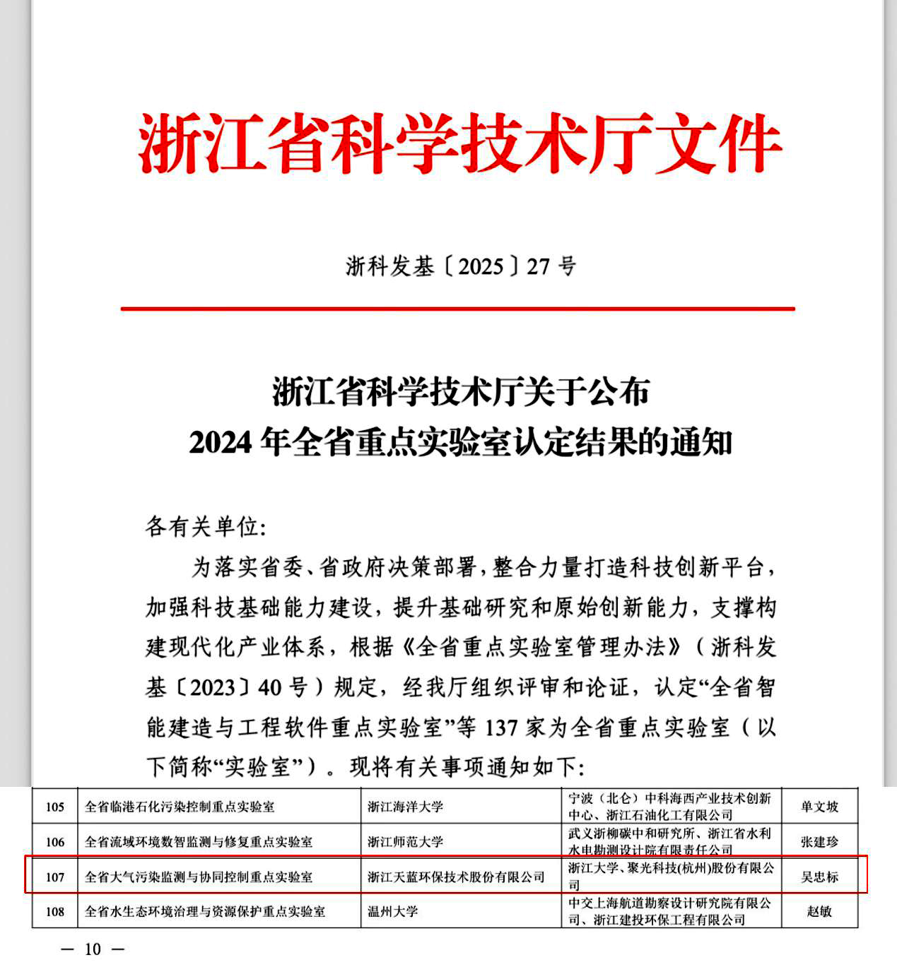 2025年6月4日,浙江省科技廳發布《浙江省科學技術廳關于公布2024 年全省重點實驗室認定結果的通知(浙科發基〔2025〕27號)》,由浙江天藍環保技術股份有限公司牽頭,浙江大學和聚光科技(杭州)股份有限公司共建的“全省大氣污染監測與協同控制重點實驗室”獲批組建,成為全省環境領域唯一以企業牽頭建設的省級重點實驗室。